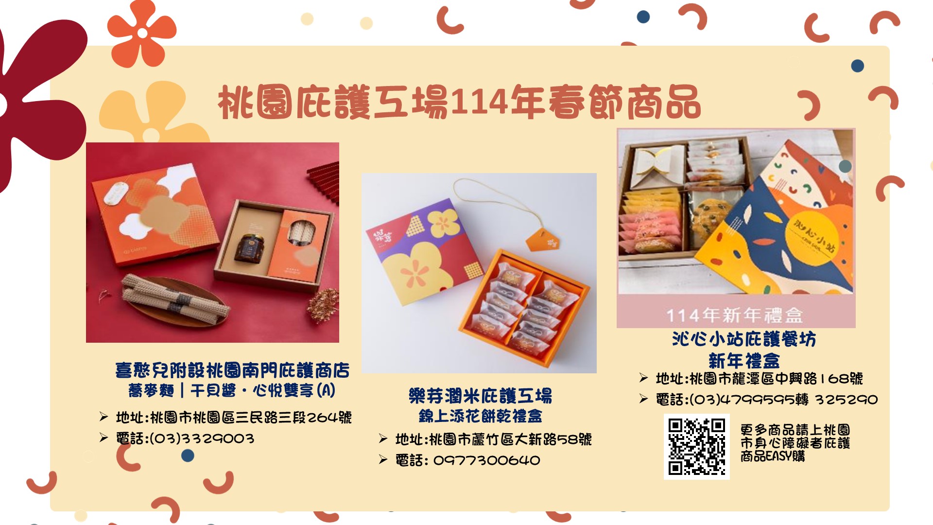 本市庇護工場,提供豐富多元的產品及服務如手作烘培、中西餐點、咖啡飲品、有機蔬菜、專業洗衣及文創印刷等,適逢年節各工場推出各式特色節慶禮盒供有送禮需求的企業及民眾選購,除實體門市外,桃園市政府勞動局設有「桃園市身心障礙庇護商品easy購」(網址: https://easygo.tycg.gov.tw/ )網路平台,呈現各家庇護工場春節產品與優惠活動資訊,產品皆由庇護工場的工作夥伴們精心製作,每一份產品的銷售,都為庇護工場的身心障礙朋友創造更多就業機會,實現自我價值。