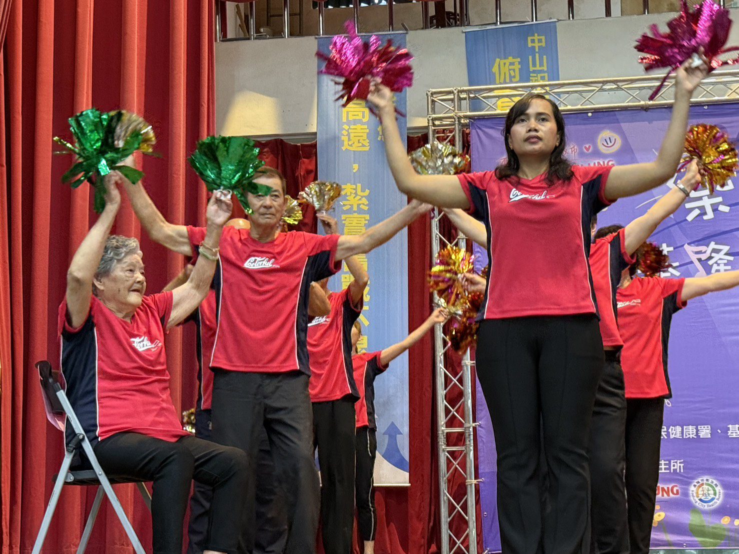 中山區首場競賽共有6組隊伍參加,參加隊伍分別由來自巷弄長照站(據點C)、里辦公處、關懷據點的長輩及志工,有180位長者共襄盛舉。現場還有加油團為參賽隊伍打氣、加油,每位長輩都使出渾身解數,展現熱情與與活力,現場掌聲不斷、氣氛溫馨又感人。值得一提的是,參賽隊伍中有許多高齡90歲以上的爺爺奶奶,在舞台上精神奕奕、活力四射,表現絲毫不輸年輕人。