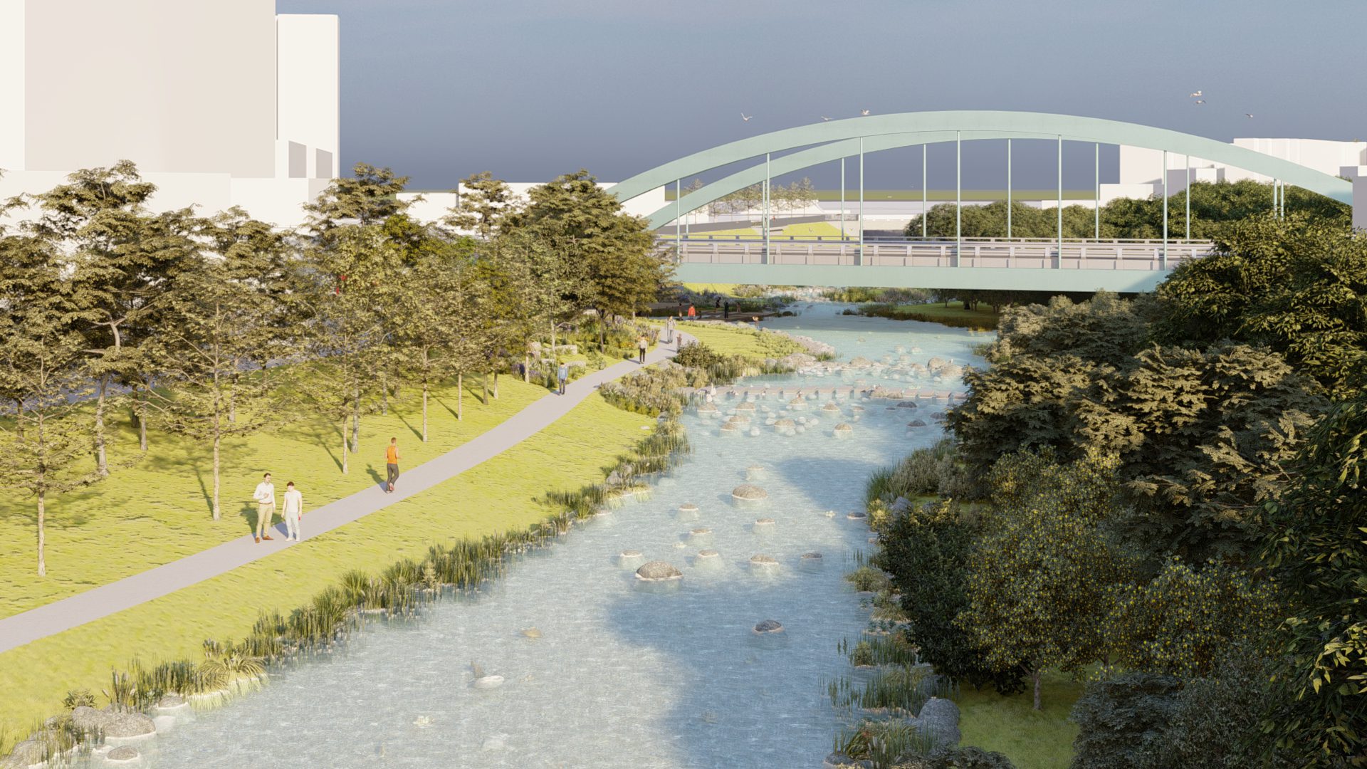 水利局說明,此工程總經費6,794萬9,000元,由中央補助78%,計5,300萬元;地方自籌22%,計1,494萬9,000元,範圍北起喬城路、南至大智路,全長約400公尺,預計於今年4月28日正式開工,工程內容包含新建200公尺人行道,形成串聯「台中之心」與「城南之心」的重要水岸步道廊帶,完善都市環狀網絡,並融入水文化與環境教育功能。