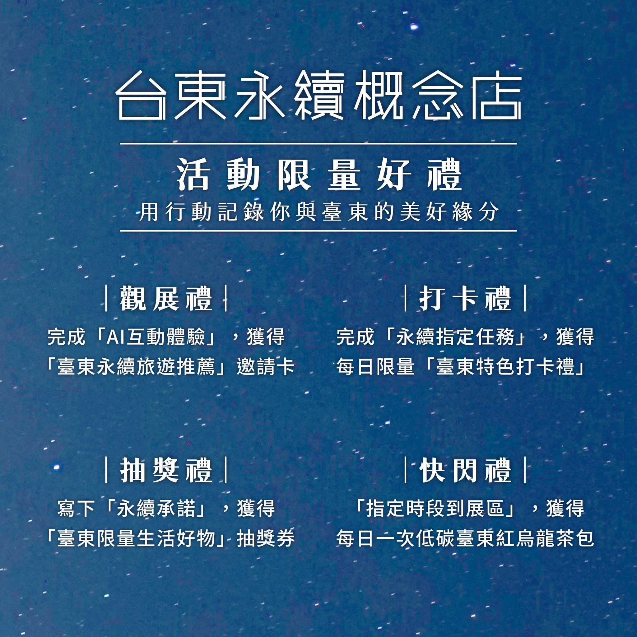 此外,展區設有靜態展板、永續文創展示及AI互動體驗等,鼓勵民眾透過參與深入了解永續理念。凡於指定時段完成「永續快閃任務」即可獲得台東紅烏龍茶包;現場拍照打卡並分享,可兌換限量打卡小禮;完成「永續行動留言」,更可參加抽獎,獎品包含以環保材質製成的台東客製雙層直傘、結合山海意象的擴香瓶、台東離島限定旭杯,以及由臺灣設計師打造的輕便旅袋,充分展現台東永續生活的質感與實用兼備。