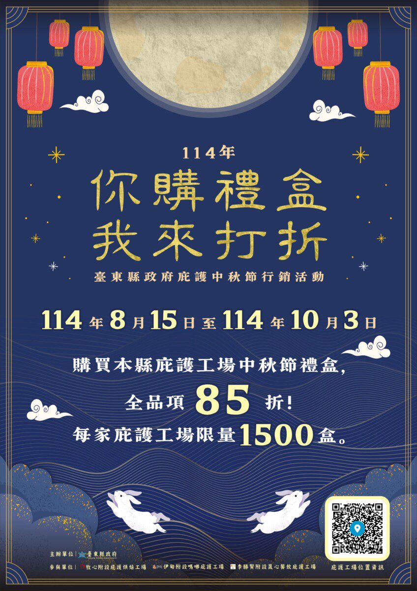 隨著中秋節腳步將近,台東縣政府推出「你購禮盒我來打折」活動,自8月15日起至10月3日止,凡購買縣內庇護工場中秋節禮盒,一律享有全品項85折優惠,每家庇護工場限量最高1,500盒。縣府希望透過此項優惠活動,鼓勵各機關團體、企業與民眾踴躍響應,讓佳節送禮不僅傳遞祝福,更轉化為對身心障礙者就業的實際支持。