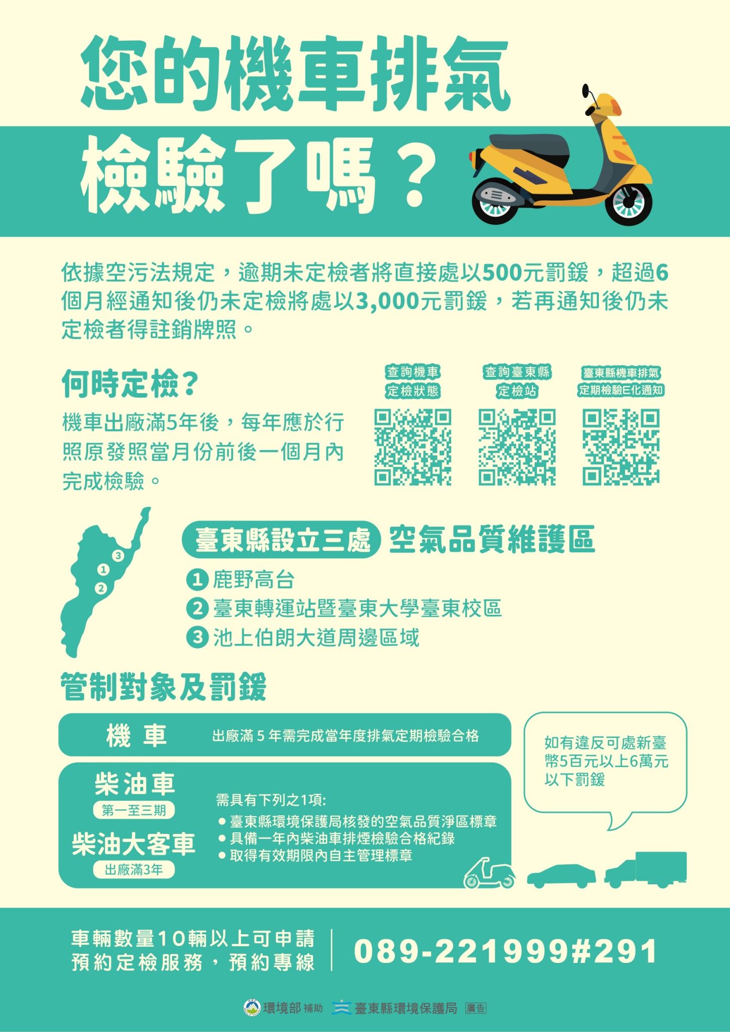 環保局呼籲,請車主平時落實車輛保養,並可主動登錄「定檢通知E化簡訊服務」(https://taitung.aetcmoto.com.tw/),透過手機簡訊即時接收排氣檢驗到期提醒,避免漏檢受罰,若需查詢排氣定檢資料,可至「環境部機車排氣定期檢驗資訊管理系統」(https://mobile.moenv.gov.tw/Motor/index.aspx),或撥打臺東縣環保局服務專線(089)221999分機291洽詢。