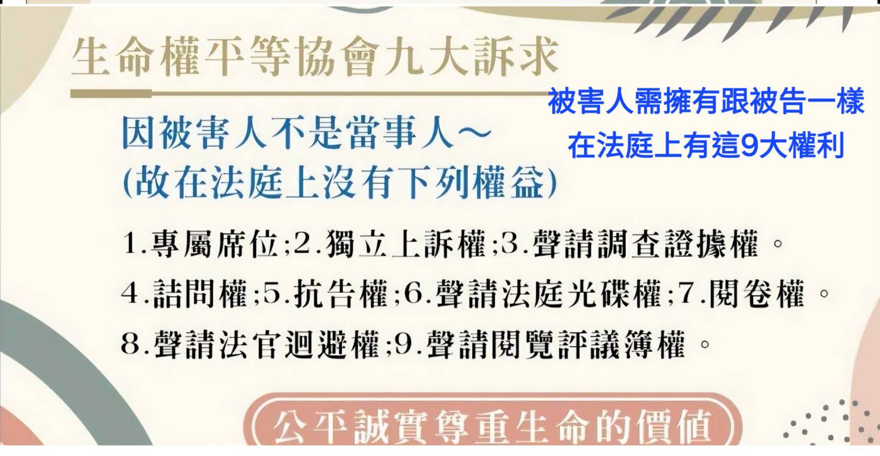 生命權平等協會指出,我國司法制度長期偏重被告權益,導致被害人及遺屬在訴訟中缺乏應有保障,淪為「司法孤兒」。協會呼籲應改革制度,讓被害人在法院享有與被告對等的九大權利,包括專屬席位、獨立上訴、聲請調查證據、詰問、抗告、閱卷及聲請法官迴避等。
