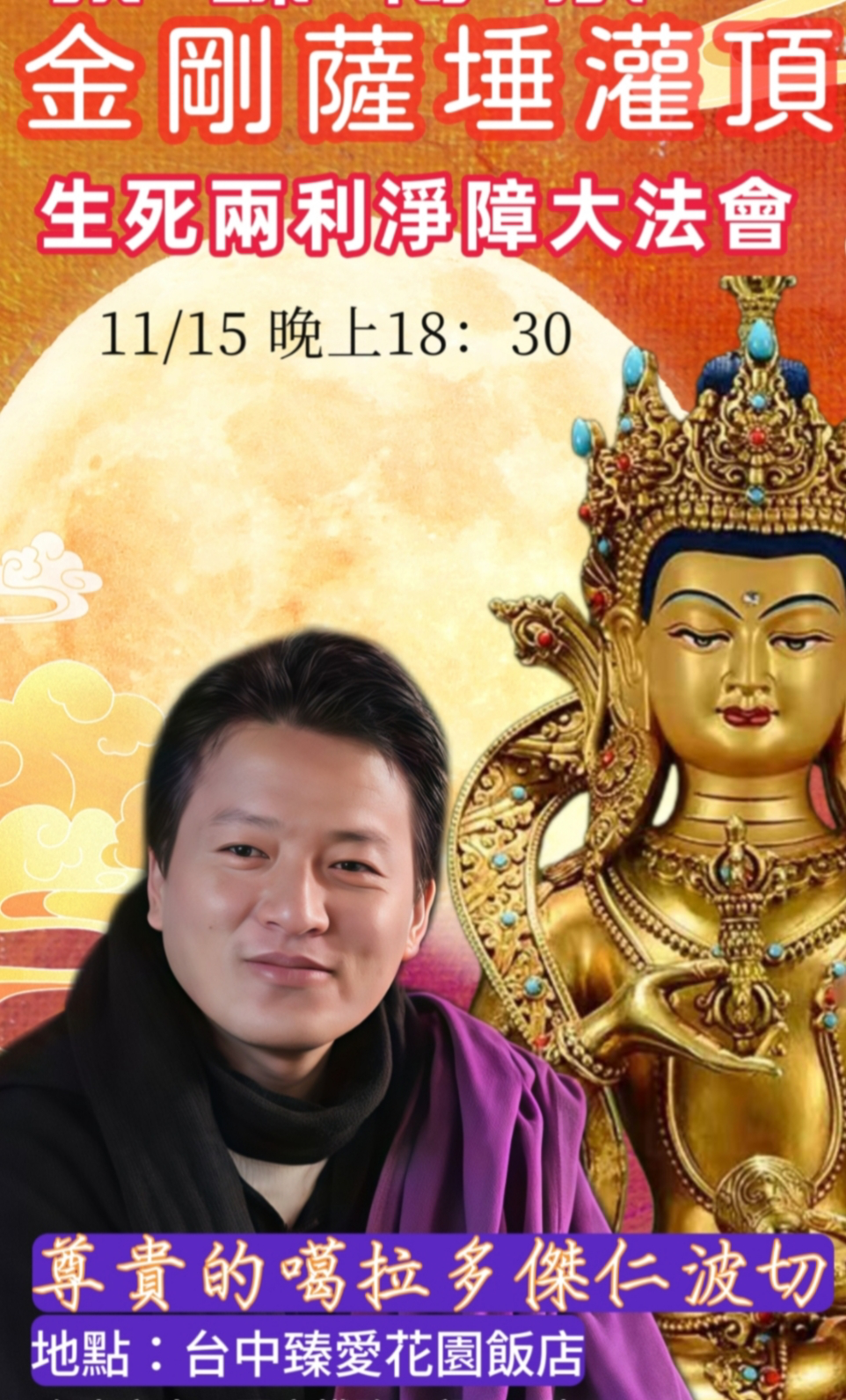 中華地藏講堂協會宣布,將於2025年11月15日(六)晚間6:30–9:00在台中臻愛花園飯店維多利亞廳(台中市烏日區高鐵路三段168號)舉行「敦珠金剛薩埵灌頂暨生死二利淨障大法會」,由尊貴的噶拉多傑仁波切親臨主法;本場次座位限300名,10/10(日)中午12:00起開放報名。主辦單位表示,本次法會結合金剛薩埵灌頂與生障/身障清淨法事,旨在淨除罪障、超薦亡者、利益現世與身後,誠邀十方善信把握因緣。