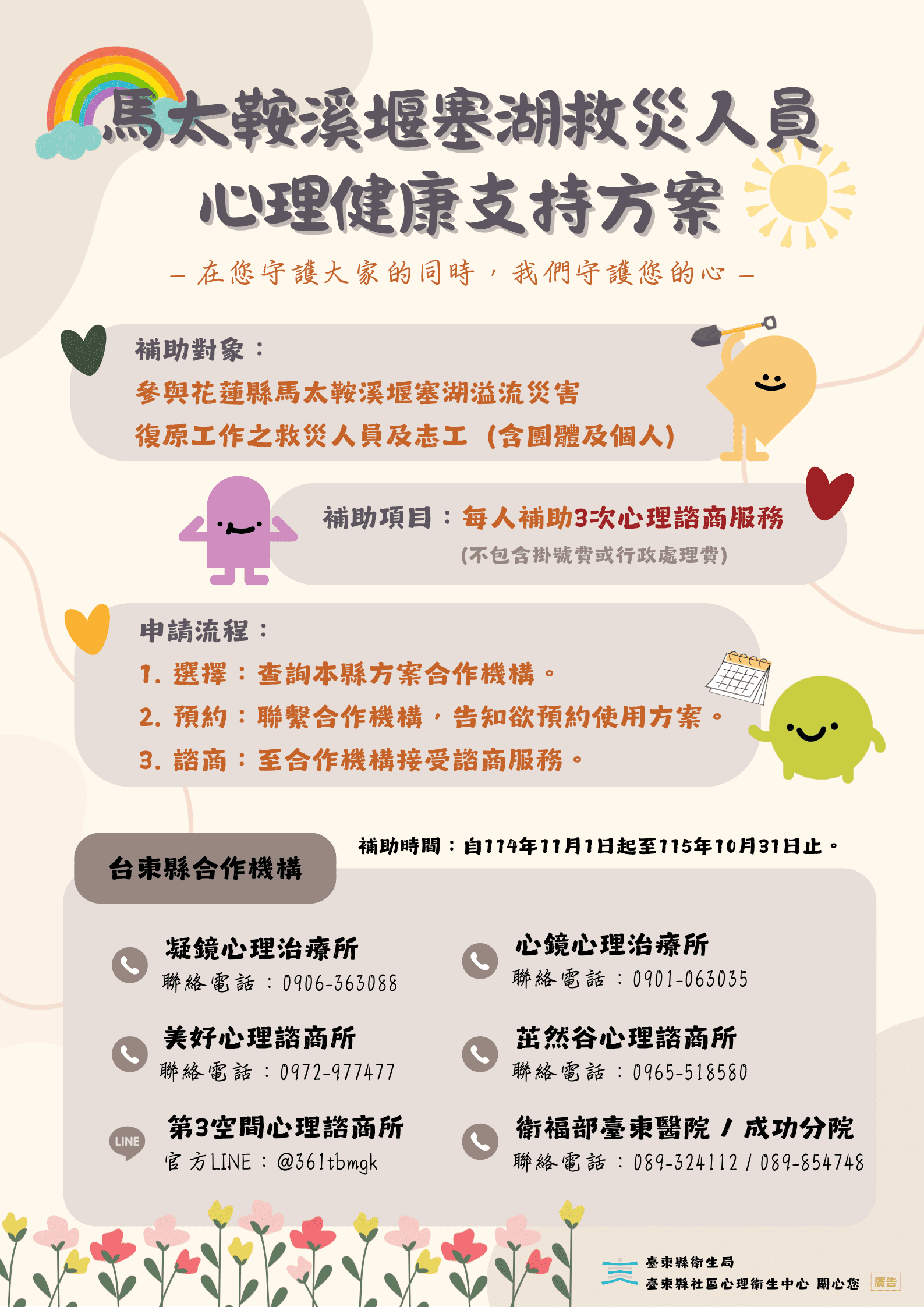 花蓮縣馬太鞍溪堰塞湖災害發生後,第一線救災人員與投入災區復原的志工們,長時間面對高壓環境、炎熱天氣與突發狀況,不僅身體極度疲憊,情緒壓力亦相當沉重。為協助救災英雄與「鏟子超人」修復身心、重拾力量,衛生福利部自11月1日起推出「馬太鞍溪堰塞湖救災人員心理健康支持方案」(簡稱「馬太鞍溪方案」),提供每人一年內3次免費心理諮商服務,成為前線夥伴安心的後盾,臺東縣衛生局呼籲救災英雄及鏟子超人尋求專業心理健康協助。