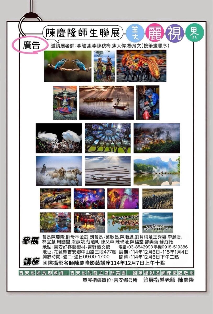 陳慶隆老師從事攝影工作40餘年,舉辦過多場攝影特展,獲獎無數,亦積極投入教學工作。近年更結合愛好攝影的先進與學生等,成立藝文攝影聯誼會,以鏡頭紀錄日常生活的人事物景象,遊歷各地風情與攝影拍攝,呈現經典雋永的影像故事。