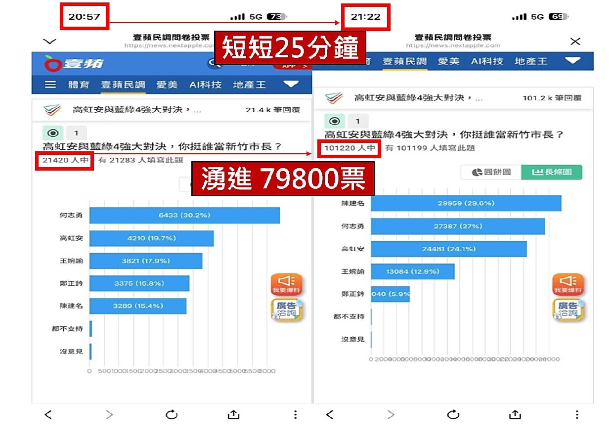 買網軍、假民調的技術手段,已經進化到真假難分的地步,可透過自動化腳本與龐大的帳號IP池,在2026新竹市長民調作假上,展示了驚人的火力,在短短的 25分鐘內,狂灌 79,800票。