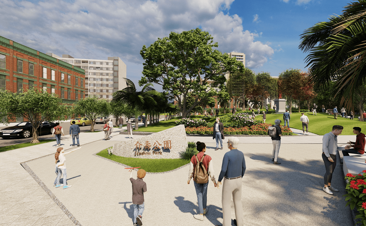 公園歷經四個不同時期建造、東西兩側截然不同風格,藉由本次整建改造重新整合元素,透過園路重新配置,並設計歷史「文化時光長廊」以改善阻隔感。[圖:工務局公園處模擬圖]
