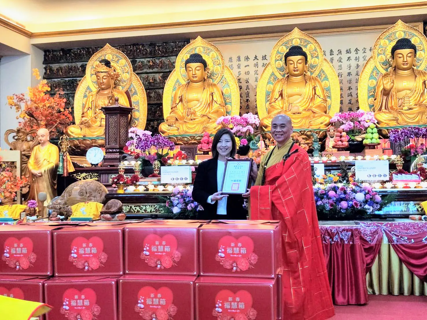 為使基隆市弱勢家戶在歲末年終也能安心迎接象徵團圓的春節,並感受到社會福利的溫暖,元亨寺臺北講堂於21日捐贈「福慧箱」共500箱予基隆市,協助春節期間有需要的弱勢家庭度過溫馨好年。基隆市政府社會處由盛慧中副處長代表回贈感謝狀,表達對元亨寺臺北講堂善行義舉的誠摯謝意。
