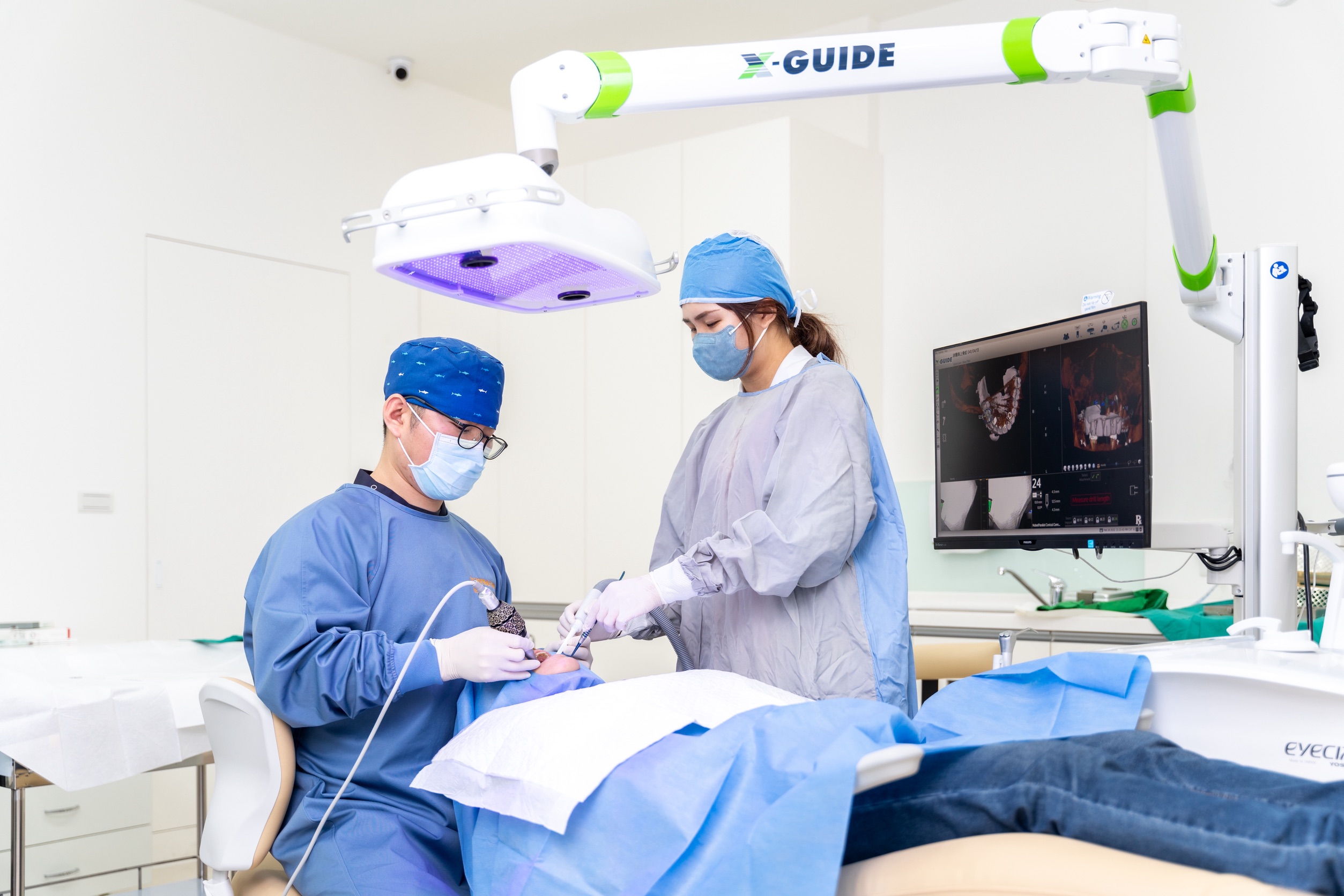 一般在手術當天,醫療團隊會依據治療計畫執行植體植入程序,配合導航植牙系統進行定位與角度控制。植體植入後,同一日可以進行臨時假牙的安裝,讓患者在手術後即可配戴臨時假牙返家,並於術後一段時間後更換正式假牙。術後正式假牙的製作與裝戴通常需數月的骨整合期視情況而定。
