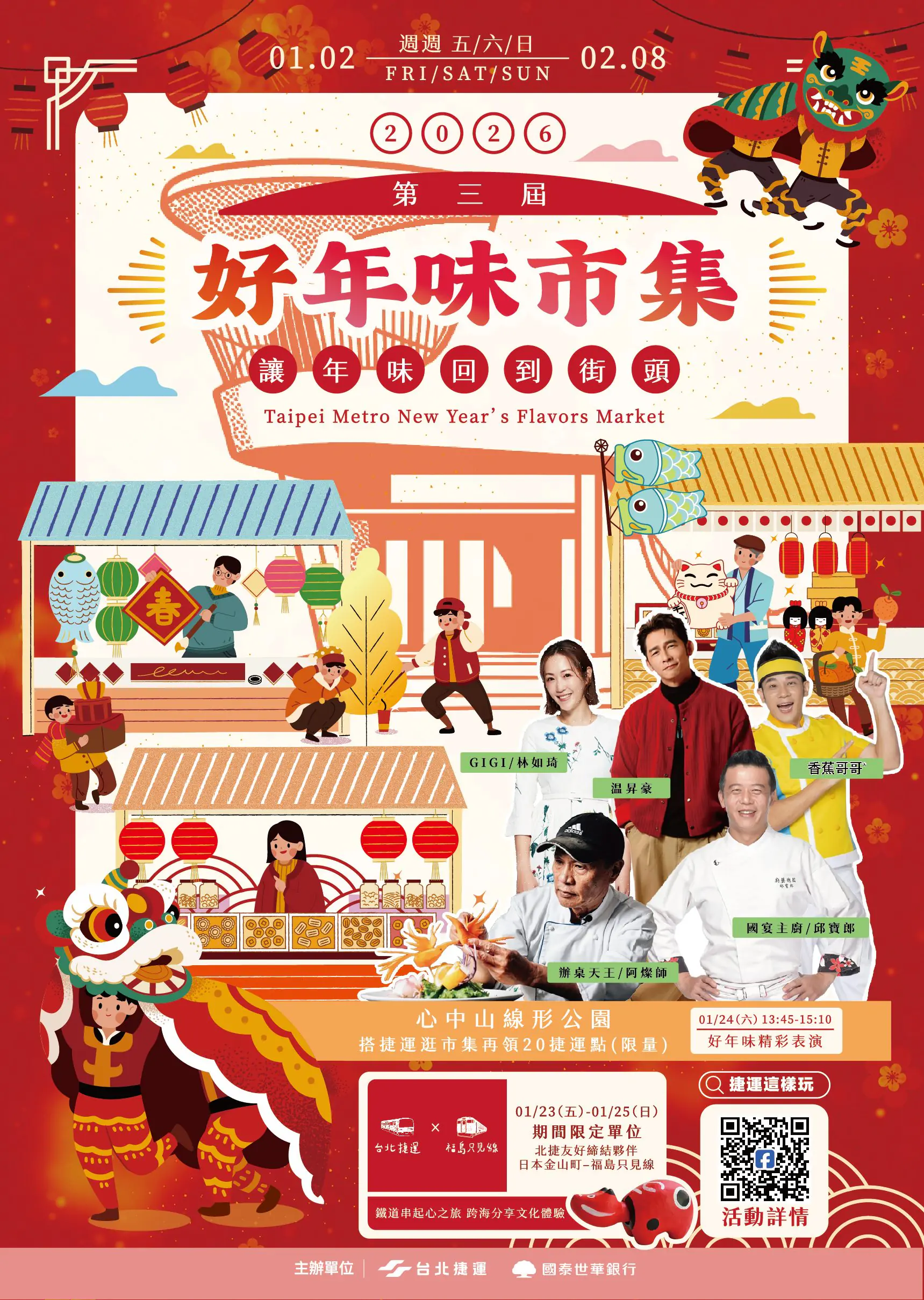 臺北捷運推出喜氣滿滿的「好年味市集」,不僅讓民眾採買年貨更方便,1月24日更在心中山廣場安排各式活動,有年菜料理秀,由凍齡男神温昇豪、辦桌天王阿燦師及國宴主廚邱寶郎,親自下廚料理「櫻花蝦米糕」、「六合金盞雞」與「客家富貴盆菜」,同時安排傳統醒獅團迎來喜氣洋洋的醒獅秀,以及香蕉哥哥帶來的精彩演出。現場也提供書海社—墨秀會書法老師揮毫春聯,讓民眾感受滿滿的節慶祝福。