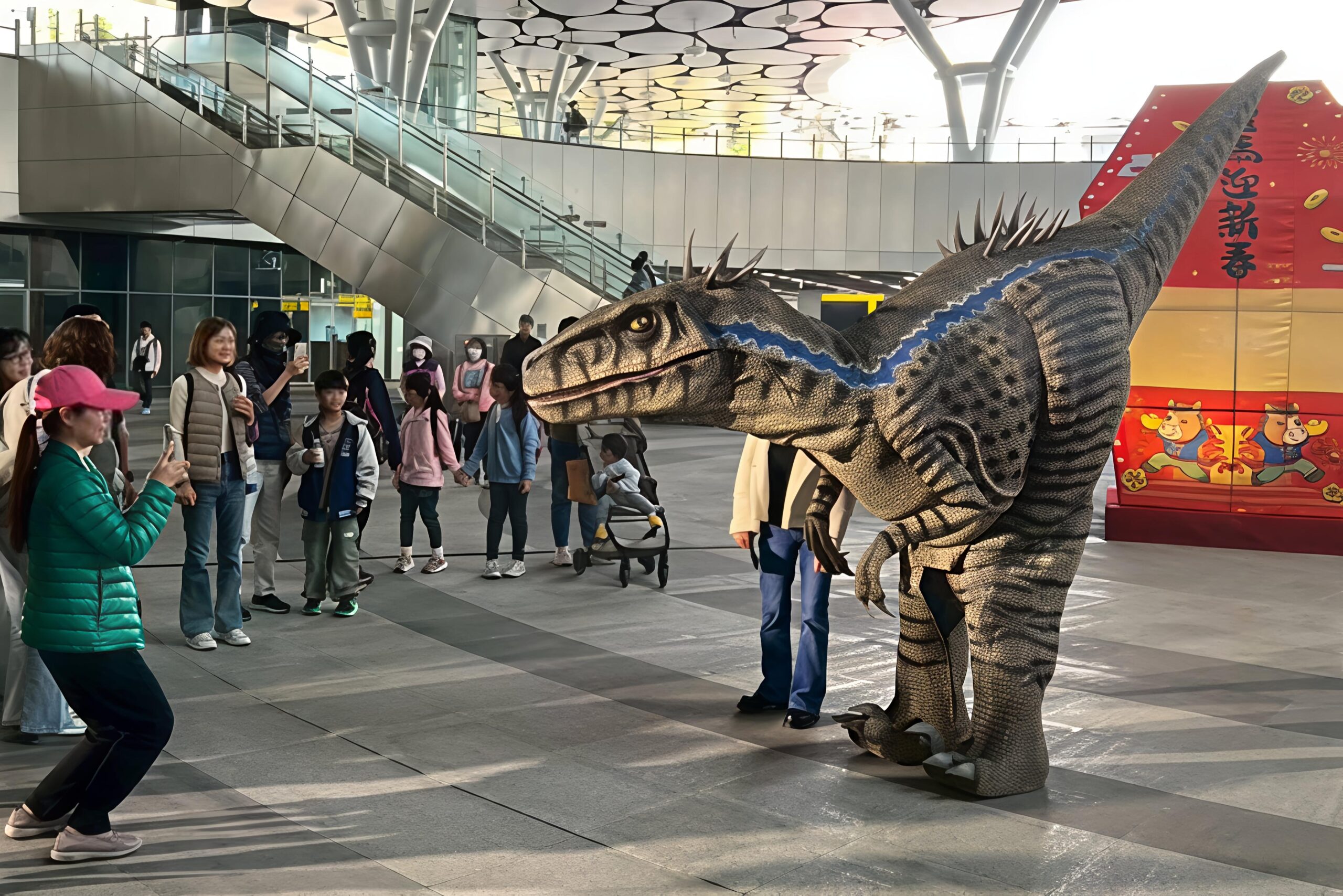 高達2公尺的機械恐龍整點驚喜現身,與民眾近距離互動,大小朋友又驚又喜,笑聲不斷。(圖/記者莊全成攝)