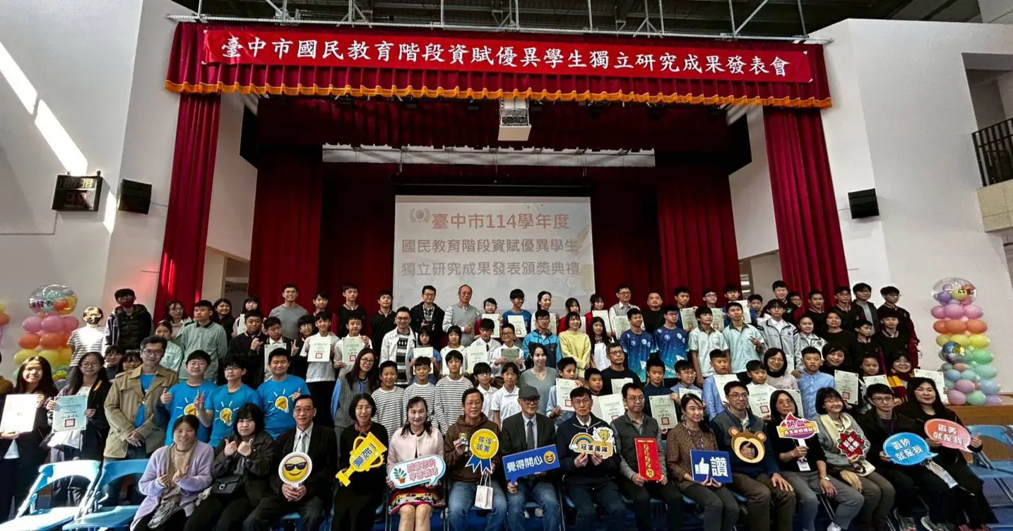 臺中市政府教育局今(29)日在成功國中舉辦114學年度國民教育階段資優學生獨立研究成果發表會,計131件作品投稿,由專家學者評選5件特優、8件優等、11件甲等及9件佳作,總計33件作品及118位學生及教師獲獎,教育局長蔣偉民出席頒獎,並邀請獲獎學生發表研究成果,獲獎教師分享指導經驗。
