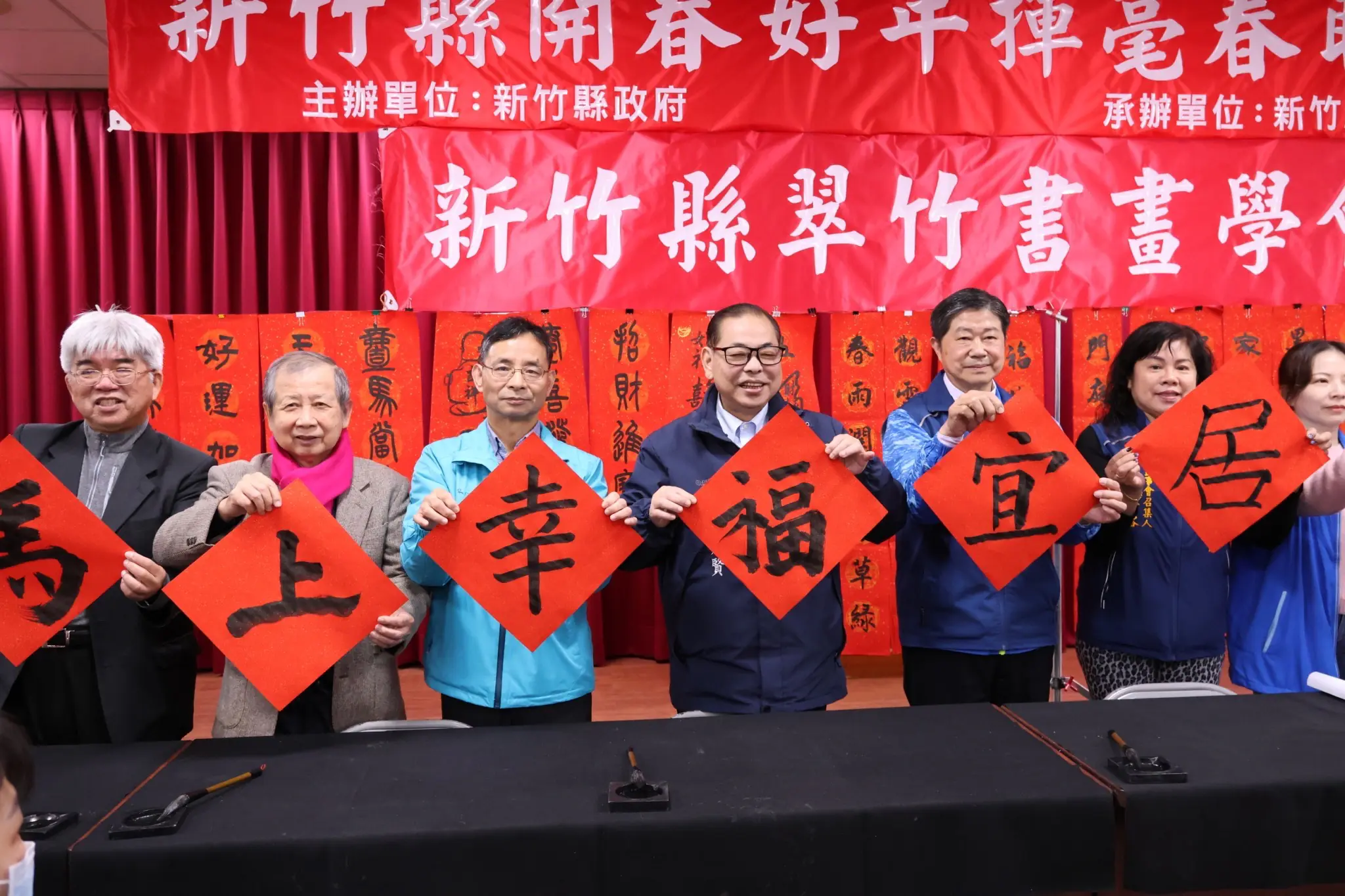 馬年將至,新竹縣政府結合新竹縣總工會今(1日)在工商大樓舉辦「115年開春慶好年揮毫贈春聯活動暨114年職訓成果展」。副縣長陳見賢、縣府勞工處長湯紹堂、新竹縣總工會理事長陳福俊、新竹縣翠竹書畫學會榮譽理事長暨知名書法家賴煥琳校長、彭祥瑀理事長等人,與多位書法名家共同開筆,揮毫寫下「馬到幸福,宜居竹縣」,為馬年新春祈福,並現場贈送春聯與民眾分享馬年喜氣,同時展出多項勞工職訓成果,展現勞工培力的豐碩成果。