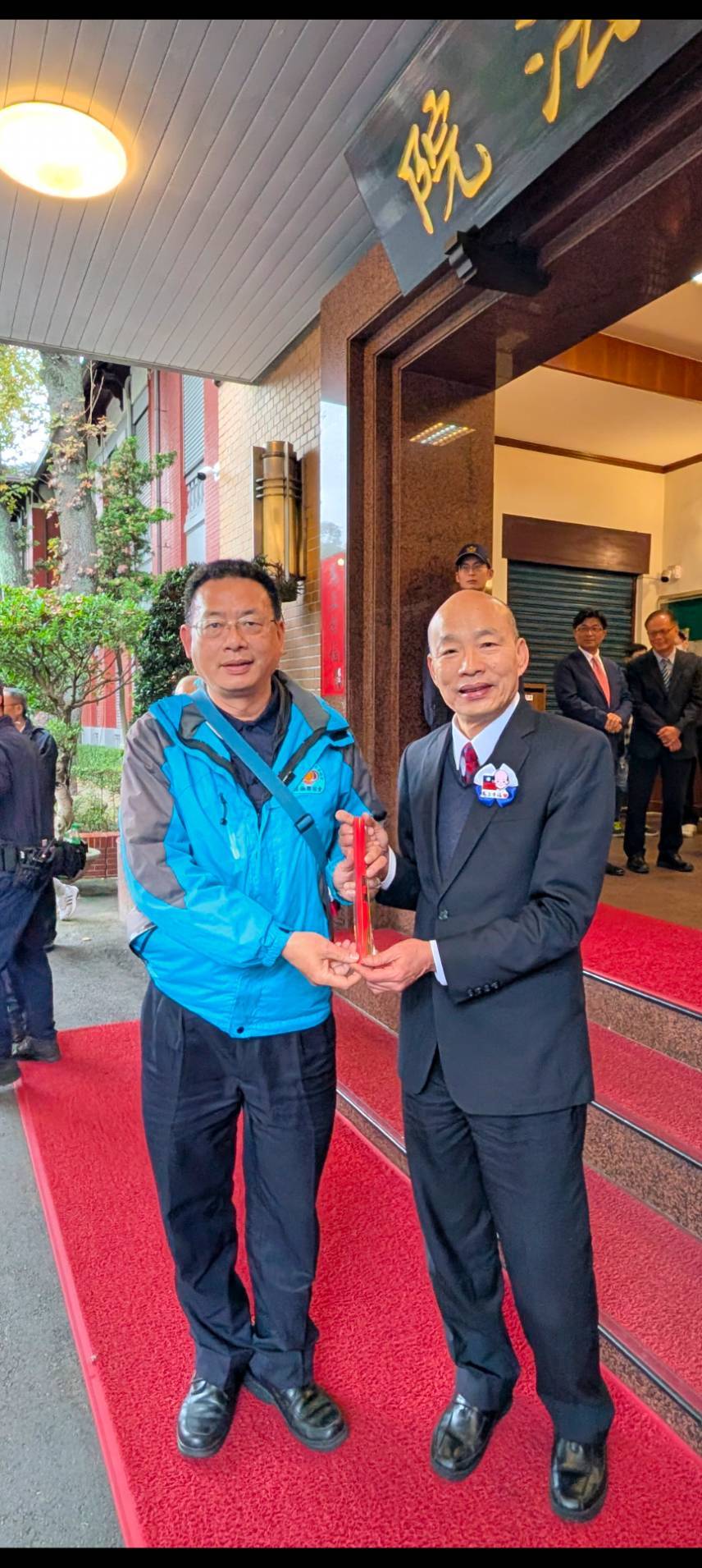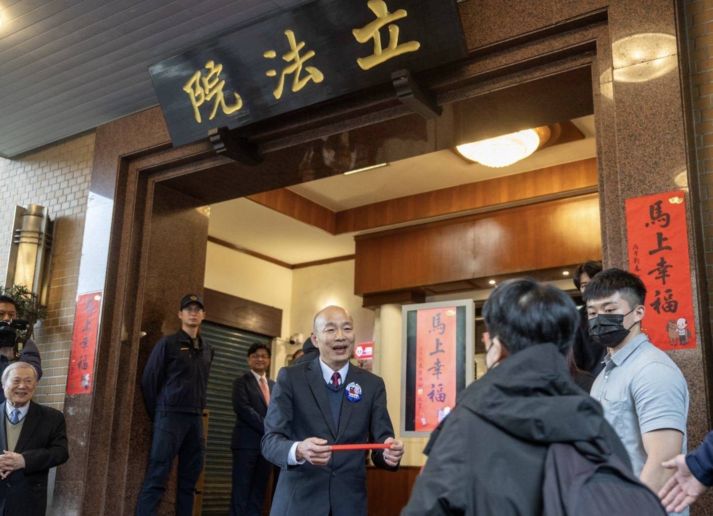 韓國瑜院長(31)日下午,在本院周萬來秘書長陪同下,於本院中山南路正門前廣場發放限量「馬上幸福」馬年特別版春聯,現場排隊民眾踴躍。