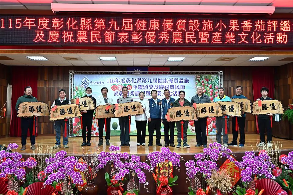 秀水鄉農會於今(3)日舉辦「115年度彰化縣第九屆健康優質設施小果番茄評鑑」頒獎典禮,同時慶祝農民節,表揚優秀農民及推廣產業文化,彰化縣長王惠美、秀水鄉農會理事長吳鑫山、常務監事李世琛及總幹事吳明信等人與會。王縣長表示,感謝農友用心栽種,讓彰化的小果番茄在市場上深受喜愛,也要恭喜27名獲得表揚的優秀農民,都是農業界的菁英與榜樣,在農業上的貢獻值得大家推崇與肯定。為協助農民,縣府規劃智慧農業補助與青農學堂,透過最新科技與農機具,讓農民耕作時更加便利,同時吸引更多青年返鄉。