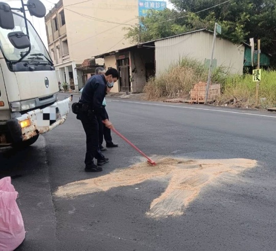 現場路面有事故車輛漏出機油,員警擔心人車行經會有滑倒受傷之慮,遂急中生智主動向附近住戶借用木屑及掃把工具,將木屑舖放在油漬上,待木屑吸乾油漬後再將其掃除,立即排除交通上恐造成之危害,維護用路人行的安全,獲得路過民眾之讚揚稱許。