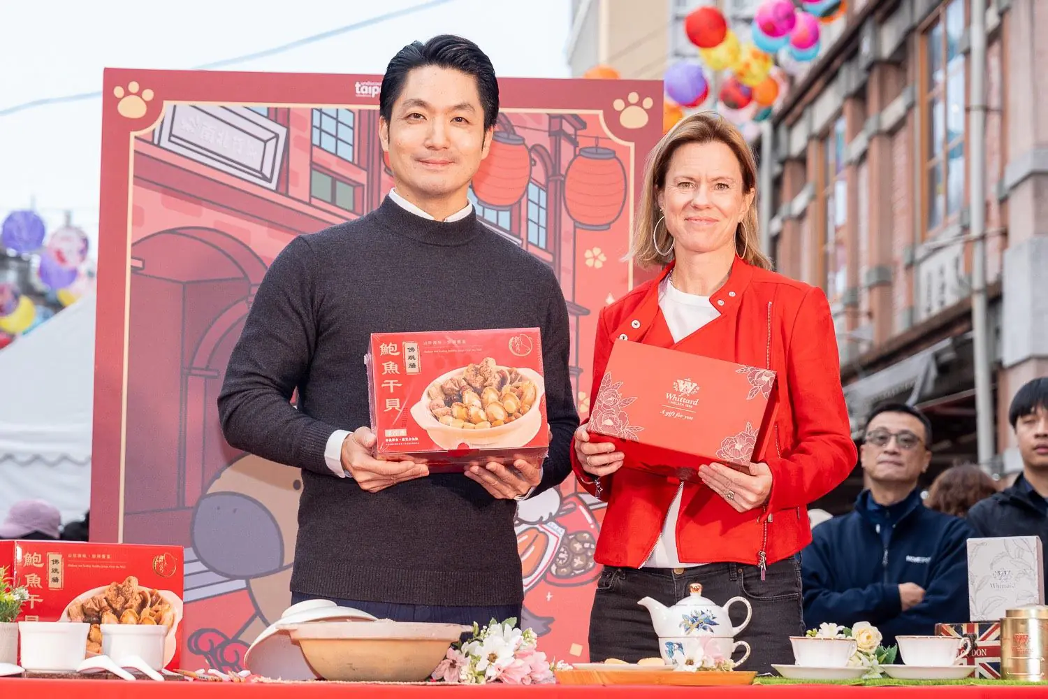 蔣萬安指出,再過兩週即將迎來馬年,而年貨大街正是感受年味最濃郁的地方。他表示,如果過年沒有來迪化街體驗人擠人、試吃零食、聆聽店家叫賣聲,就好像少了點什麼。因此他力邀所有民眾,尤其是國內外旅客,務必親自走訪迪化街。蔣萬安特別提到,包含今天出席的英國代表,以及前不久挑戰攀登臺北101的Alex Honnold及其夫人,他們都親身體驗大稻埕迪化街的風情,證明迪化街就是最棒的城市宣傳,活動最後蔣萬安更與英國在台辦事處代表包瓊郁( Ruth Bradley-Jones)一同吃小吃、套圈圈同樂,包代表更向蔣市長送上英國茶祝大家新年「錢滿袋」。蔣萬安感謝鄭理事長及所有商圈夥伴的努力,共同將這張代表臺北的名片遞送到全世界。