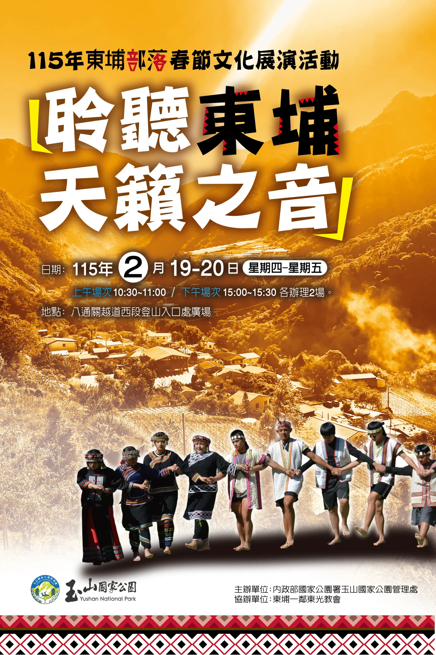 內政部國家公園署玉山國家公園管理處(以下簡稱玉管處)訂於 115 年 2 月 19~20 日(星期四~星期五),在南投縣信義鄉東埔 1 鄰東埔 服務中心廣場,辦理「115 年東埔部落春節文化展演~聆聽東埔天籟之 音」活動(每日 2 場次,上午場次 10:30~11:00、下午場次 15:00~15:30),讓到訪的朋友欣賞自然山川美景之餘,進而聆聽布農 族天籟音樂並了解在地原住民深厚文化底蘊,活動精彩可期,不容錯 過!請大家把握良機,細細品味東埔美好新春饗宴。